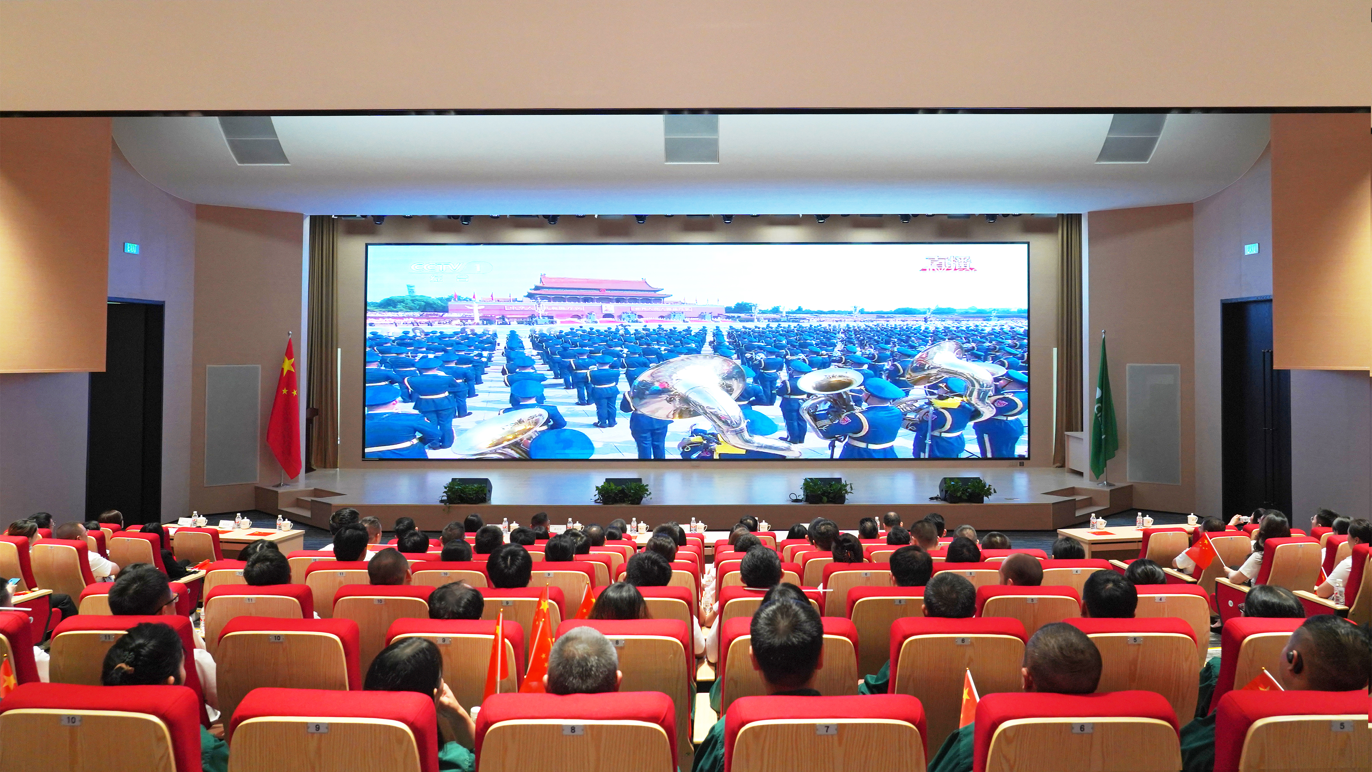 上午9時,報告廳內(nèi)燈光漸暗,全體員工整齊就座。隨著紀念大會正式開始,大屏幕上呈現(xiàn)出天安門廣場的莊嚴畫面,人民英雄紀念碑在朝陽下莊嚴挺立,十萬軍民肅立無聲。當國歌奏響時,全體鑫政人起立高唱國歌,肅穆之情彌漫整個會場。在兩個多小時的直播過程中,會場始終保持莊重肅穆的氛圍,不時響起的自發(fā)掌聲,傳遞著鑫政人心中的感動與自豪。