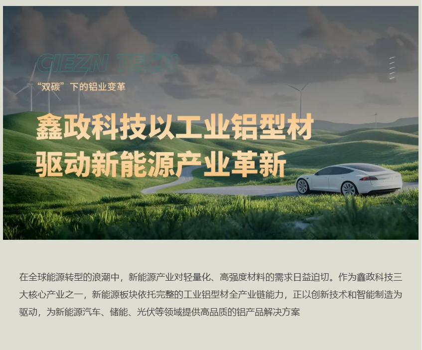 鑫政深耕工業(yè)鋁型材領(lǐng)域,全面布局新能源產(chǎn)業(yè),持續(xù)拓展產(chǎn)品矩陣。在汽車輕量化領(lǐng)域,創(chuàng)新研發(fā)電池托盤(pán)、端板、防撞梁、門檻梁等核心部件;在清潔能源領(lǐng)域,積極拓展儲(chǔ)能系統(tǒng)支架與光伏型材。通過(guò)特種合金黃金比例配方與精密壓延工藝的深度融合,鑫政正以材料創(chuàng)新和技術(shù)創(chuàng)新助力全球綠色產(chǎn)業(yè)升級(jí)。